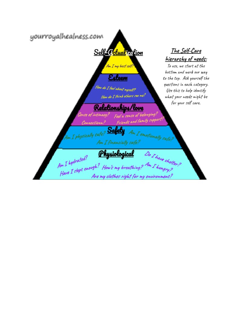 Once you have figured out what is a priority to you, now you can look at what do you need to achieve it. Self-care can also be prioritized by what needs are essential. Look at Maslow’s hierarchy of needs– first you need your physiological needs met in order to get your safety needs met, then once your safety needs are met, you continue up to more mental states of self-care including relationships, esteem and self-actualization. I made the following diagram for you to use to determine where you are at.